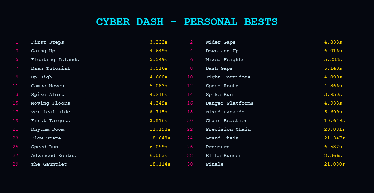 Cyber Dash is a fast-paced neon speedrunning platformer — free, no download, plays instantly in your browser.