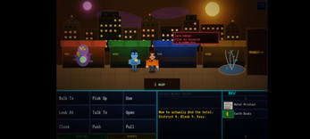 - Classic SCUMM-style interface: Look · Talk · Use · Push · Pull · Open · Close · Pickup
