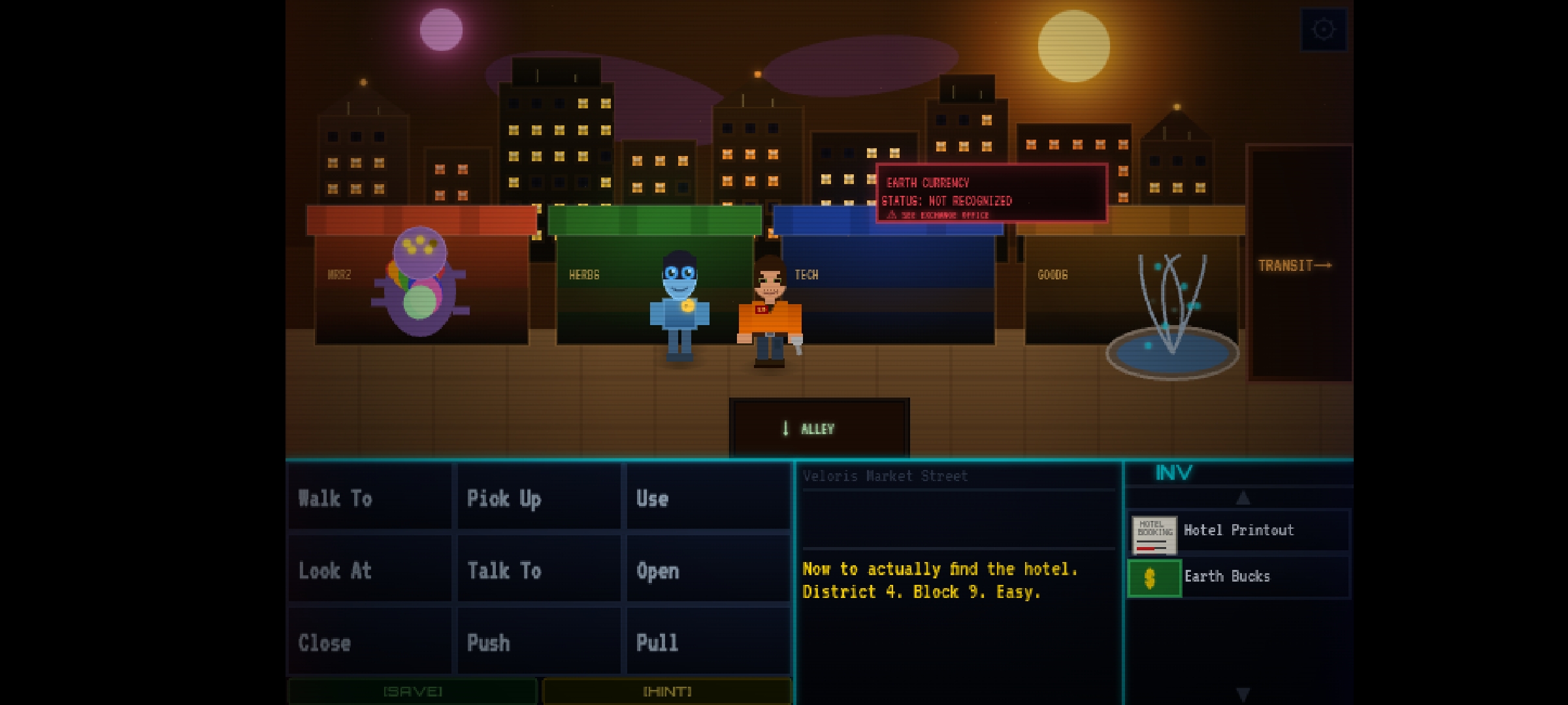 - Dozens of NPCs including a robot with 3% memory, a four-armed shopkeeper, a customs officer named after bureaucracy, and a tiny alien deeply committed to doing human things incorrectly