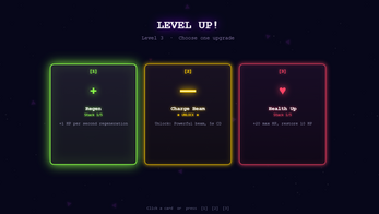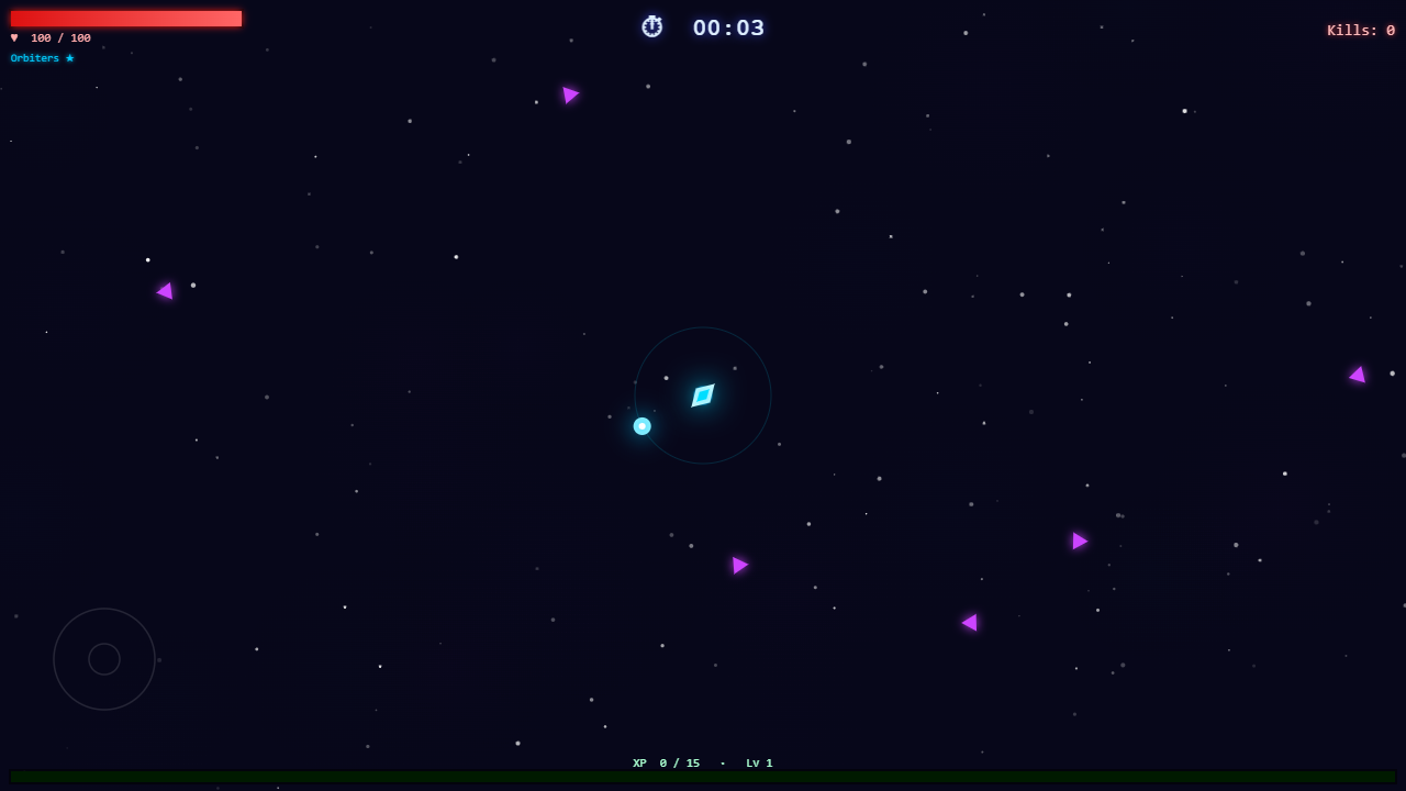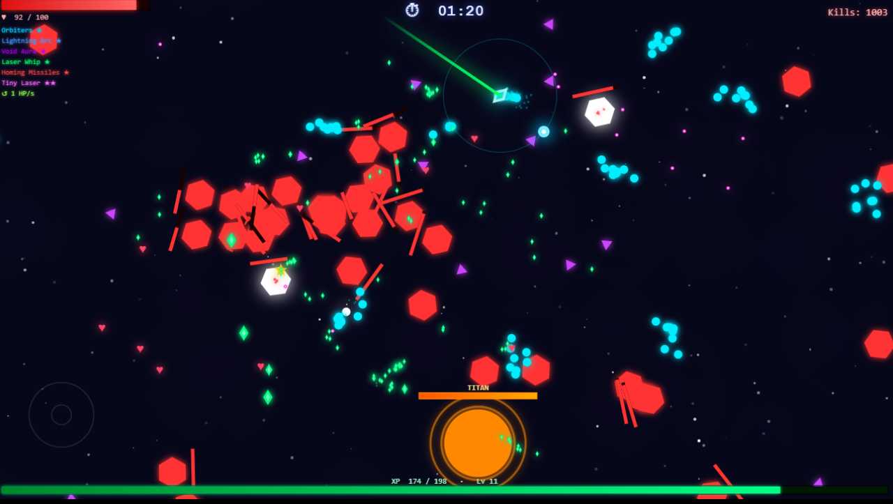 Each run is different: 6+ weapons to unlock (Orbiters, Spread Shot, Lightning Arc, Void Aura, Laser Whip, Homing Missiles) plus passive upgrades for speed, armor, HP regen, and magnet range. Level up up to 60 times per run, evolving your build toward unstoppable power — or die trying when the Titans arrive.