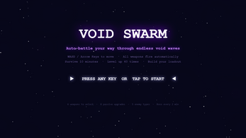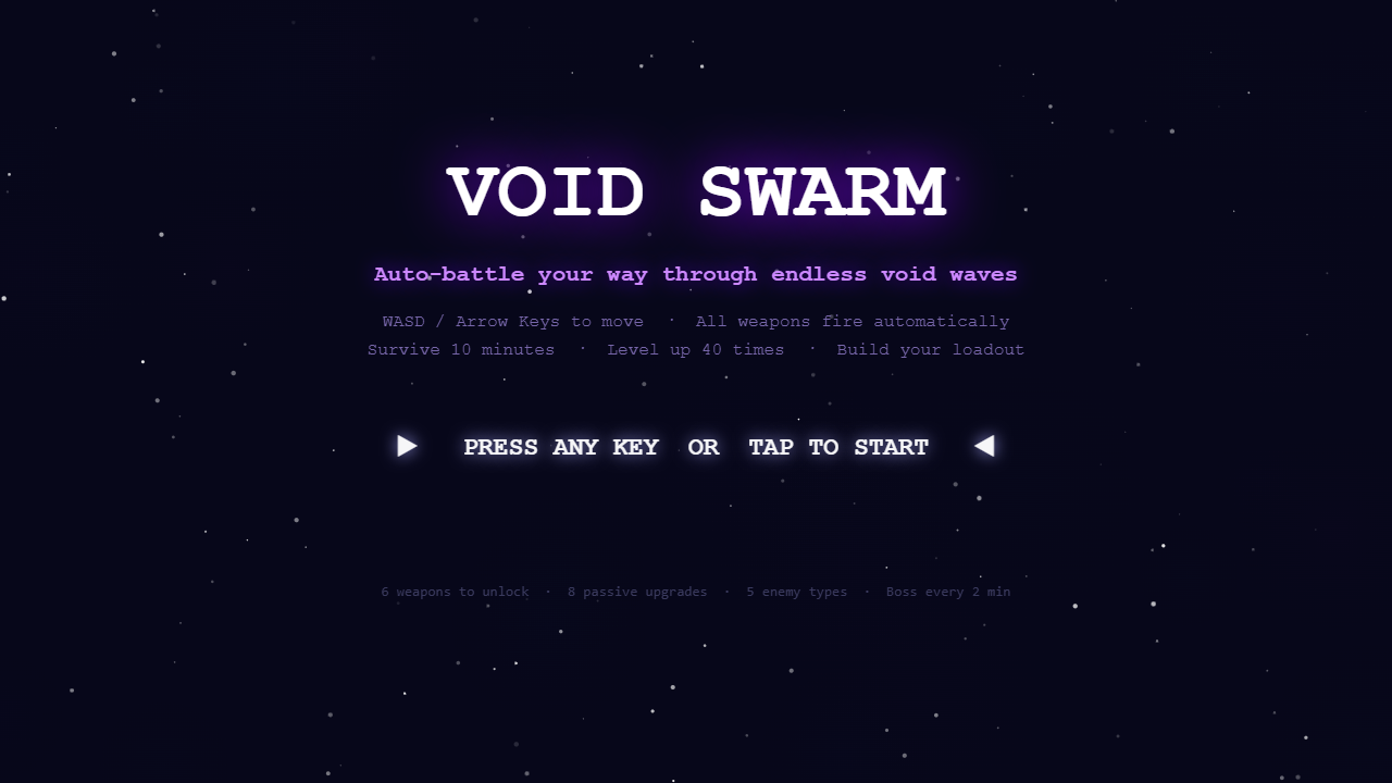 Void Swarm is a fast-paced browser roguelite in the bullet-heaven genre. You don't aim — you move. Your weapons attack automatically while you weave through endless swarms of void creatures. Survive 10 minutes, level up, choose upgrades, and build a devastating weapon loadout from scratch every run.